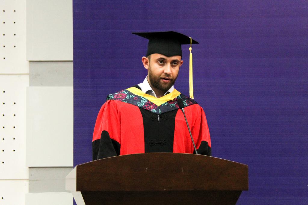 1999届轮机专业校友华军杰、2015届船舶工程技术专业校友毛晟亦、2008届旅游管理专业校友刘晓、2015届商务英语专业校友张玉婷和乌克兰马卡洛夫国立造船大学国际部主任Mykhailov Mikhail也为毕业生们送上了真挚的祝福和宝贵的建议。