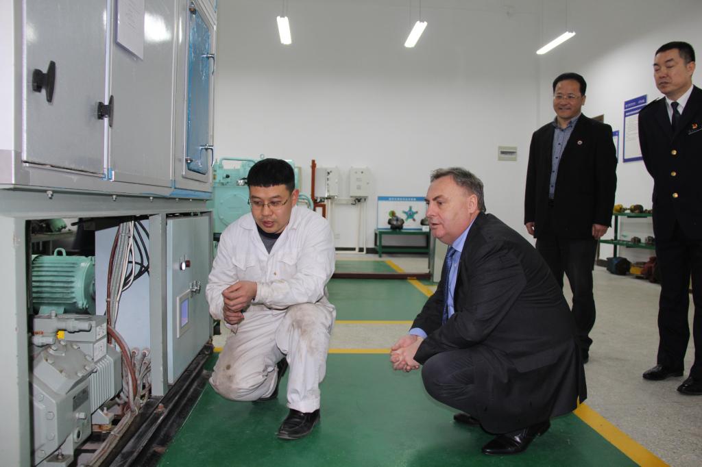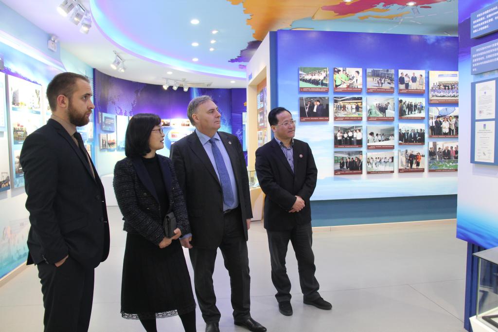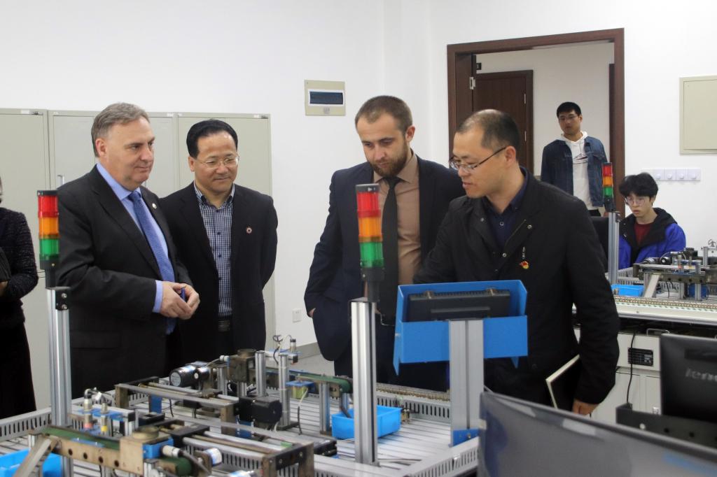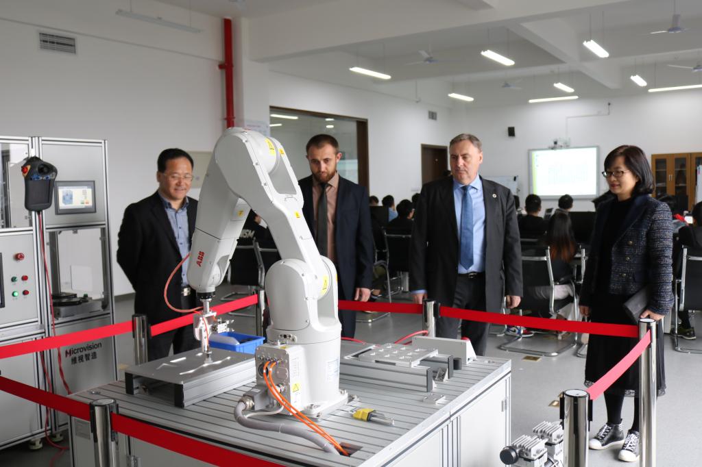 在党委委员、副校长孔志光和办公室、宣传部、外事办、科研处、二级学院相关人员陪同下,Trushliakov Eugeniy校长和Mykhailov Mykhailo主任还参观了校史馆、航海和船舶类专业实训室、中乌机器人实训室、海邮驿站等,对我校的办学特色和先进的实训设备表示高度赞赏。(文/颜天明 图/赵怡琦、朱琳)