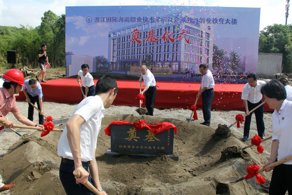 7月17日上午,我校社会服务与创业教育大楼工程开工奠基仪式在即将落成的体育馆北面工地举行。校党委书记陈松华、校长吴中平,校领导张新杰、孔志光、李丽、刘相、江爱芬、孔志华,舟山市公共项目建设中心主任陈岳龙,以及学校干部师生代表、施工单位代表等近百人参加。仪式由李丽副校长主持。