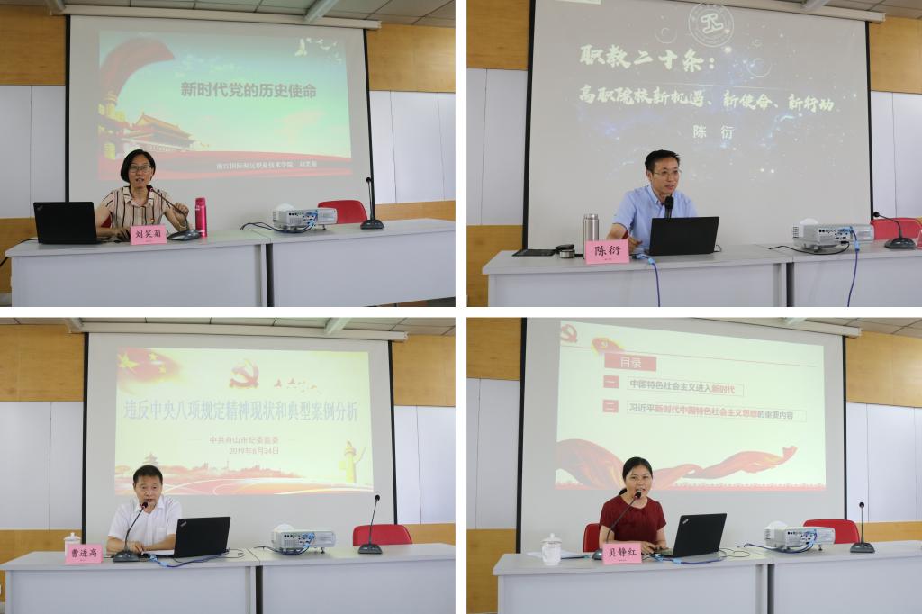 学校党委委员、宣传部、统战部部长孔志华以《如何规范性执行党政联席会议和党组织会议》为题做业务辅导;学校组织部(人事处)副部长(副处长)李晓璐和社科体艺部副主任刘笑菊分别进行授课。此外,学员们还认真聆听了浙江工业大学教授陈衍所作的题为《职教二十条:高职院校新机遇、新使命、新征程》、市纪委办公室主任曹进高作的题为《违反中央八项规定精神现状和典型案例分析》、浙江海洋大学教授贝静红作的题为《习近平新时代中国特色社会主义思想解读》、市机关党委副书记戴惠恩作的题为《“三会一课”会议记录规范性指导》、市委组织部干部监督处副处长王志勇作的题为《做好新形势下发展党员工作面临的主要问题与对策思考》等5场专题讲座。全体学员遵守纪律,积极参与,以饱满的学习热情和良好的精神状态,专心听讲、深入思考、交流替换、探讨工作。