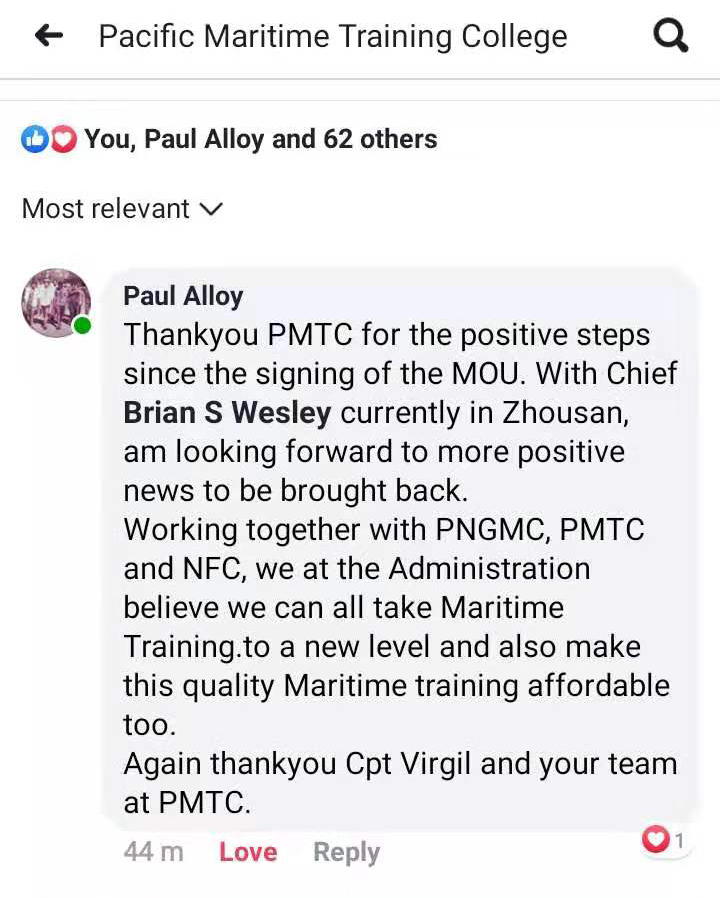巴新国家海事局质量和证书处主任Paul Alloy先生在PMTC所发布的新闻动态下评论道:“感谢太平洋海事学院PMTC在船员培训方面所取得的积极进展,期待在舟山的PMTC教师带来更多的好消息。我们相信,在各方的合作努力下,能把我们的海事培训提高到一个新的水平。”