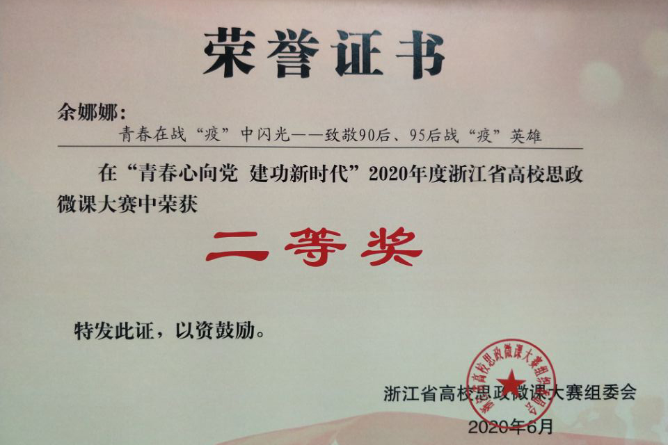 近日,校团委选送的《青春在战“疫”中闪光-——致敬90后、95后战“疫”英雄》 和《青春战疫建功立业新时代》两件作品分别在2020年度浙江省高校思政微课大赛中荣获教师组二等奖和学生组三等奖。本次大赛由团省委、省教育厅、省学联联合组织举办,校团委从5月开始广泛动员全校6个二级学院学生和青年教师参与,经过校内选拔,最终确定了3件教师组作品和2件学生组作品参加省赛,涵盖了服务奉献类、理想信念类、疫情防控类3个类别。