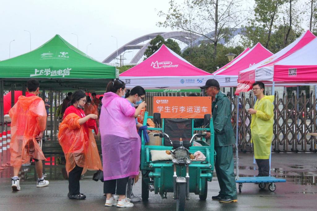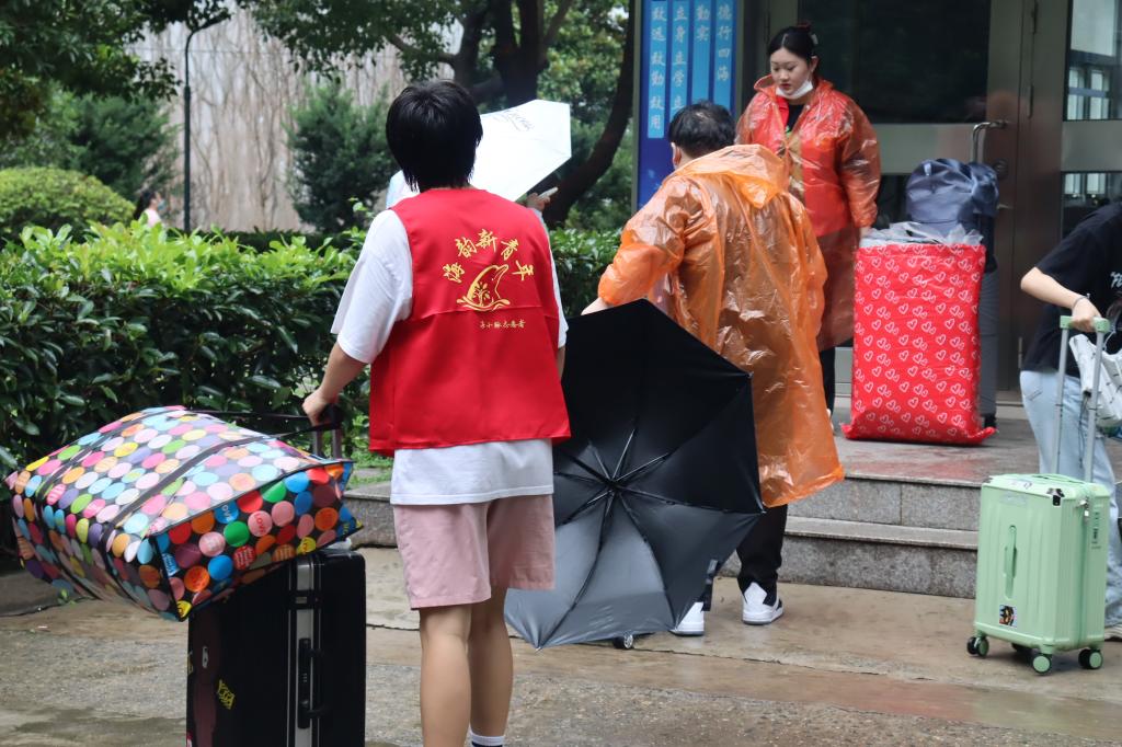 风雨中,志愿者的头发早已被雨水浸得湿透,手里的工作却一刻不停,帮助新生搬运行李。
