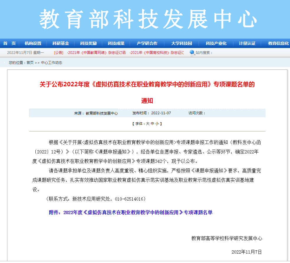 11月7日,教育部发布了《关于2022年度<虚拟仿真技术在职业教育教学中的创新应用>专项课题名单的公示》,我校航海工程学院郝永志老师主持申报的《高职院校虚拟仿真实训基地建设路径与成效研究——以现代航运虚拟仿真实训基地为例》成功获批立项。