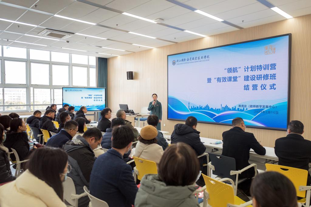 2月16日上午,学校“领航”计划特训营暨“有效课堂”建设研修班结营仪式在学校图书馆四楼教师发展中心智慧教学空间411顺利举行。副校长李丽,宁波职业技术学院教师培训学院副院长姒依萍,学校教务处班子成员、各教学单位相关领导及参训教师50余人参加了本次结营仪式。