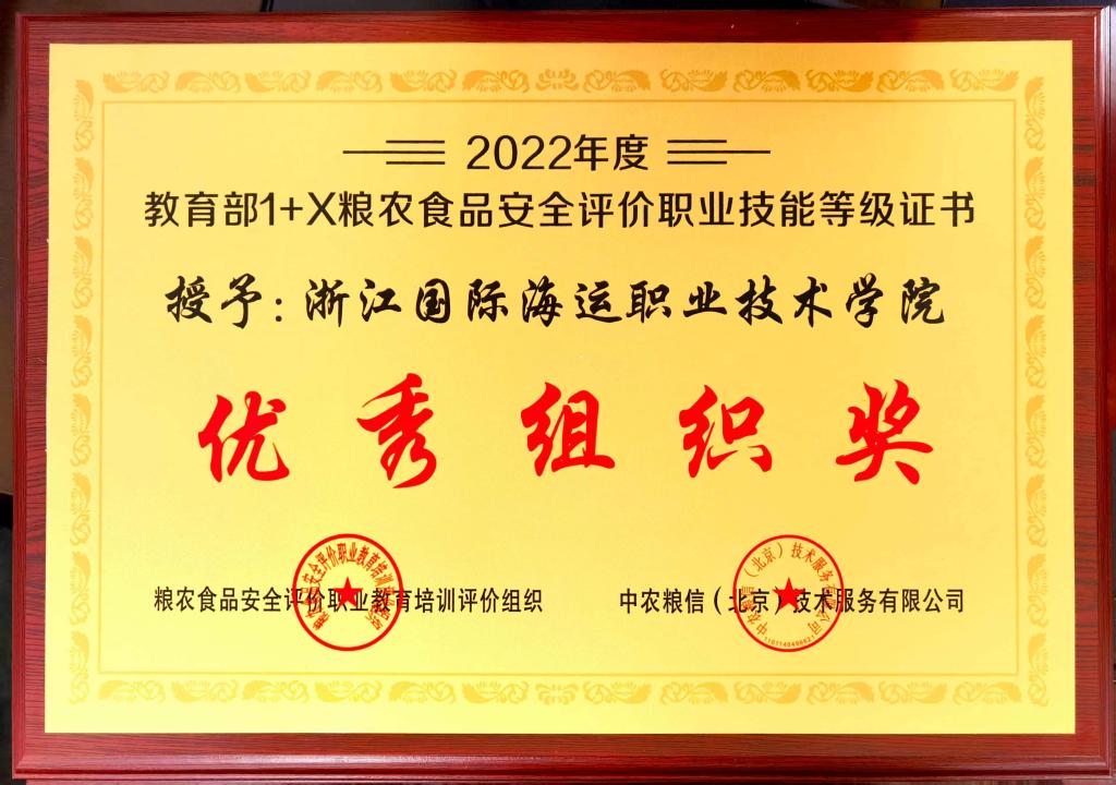 近日,海洋旅游学院食品专业团队荣获粮农食品安全评价职业教育培训评价组织授予的“领军院校奖”、“优秀师资团队奖”、“优秀组织奖”荣誉称号,以表彰在2022年度1+X试点推进工作中所作出的突出贡献。