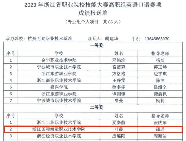 经过激烈角逐,由国际教育学院邵瑶老师指导的2021级应用英语2班叶晨同学获得专业组比赛二等奖、总分第9名的好成绩,也是我校学生在此项比赛中取得的新突破。由国际教育学院丁开君老师指导的2022级商务英语1班徐瑞同学和海洋旅游学院邱燕老师指导的2021级国际邮轮乘务管理1班赵荣杰同学分获专业组和非专业组比赛三等奖。