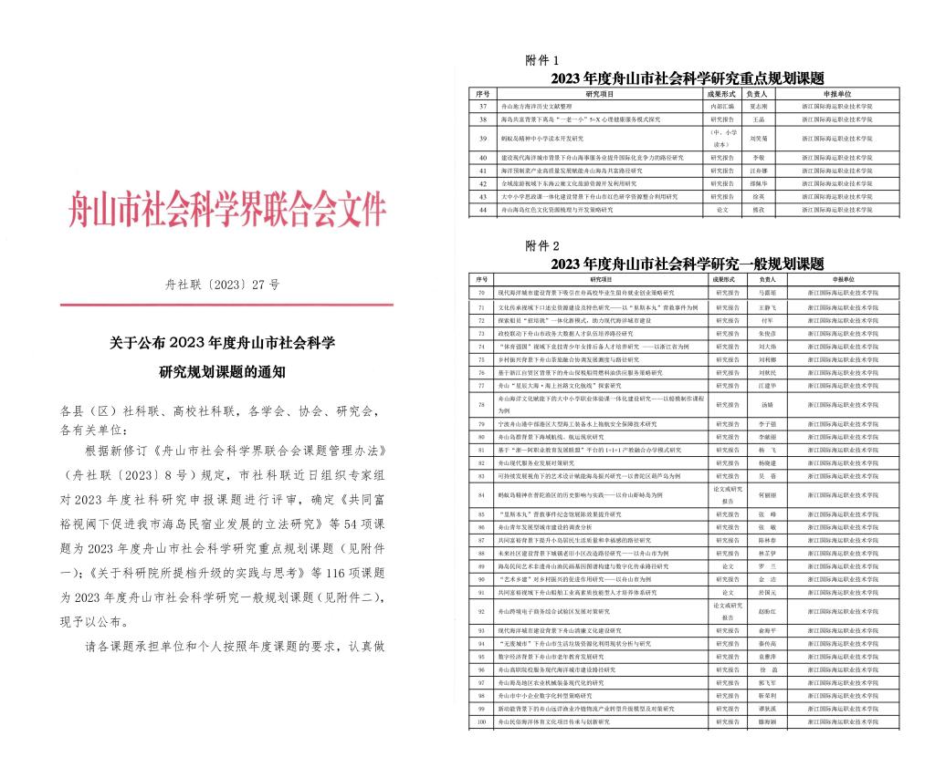 近日,从舟山市社科联公布的《关于公布2023年度舟山市社会科学研究规划课题的通知》(舟社联〔2023〕27号)中获悉,我校共有38项课题立项,其中获2023年度重点规划课题8项,一般规划课题30项。另外,已获专项研究课题立项1项。截至5月,我校承担舟山市社科联的各类研究课题共计39项,立项数创历史新高。