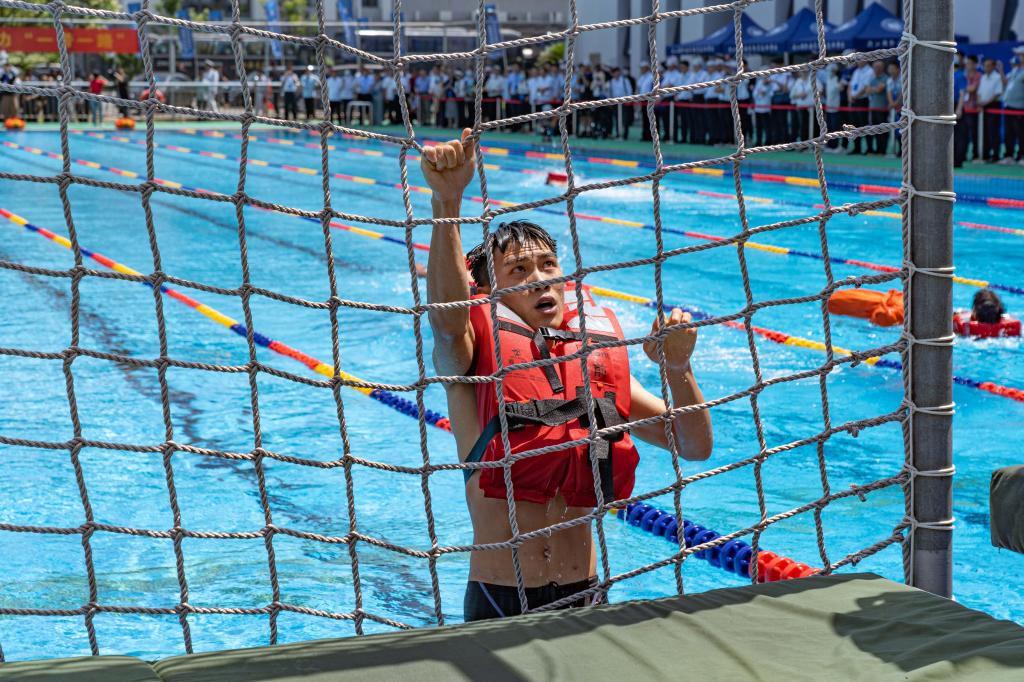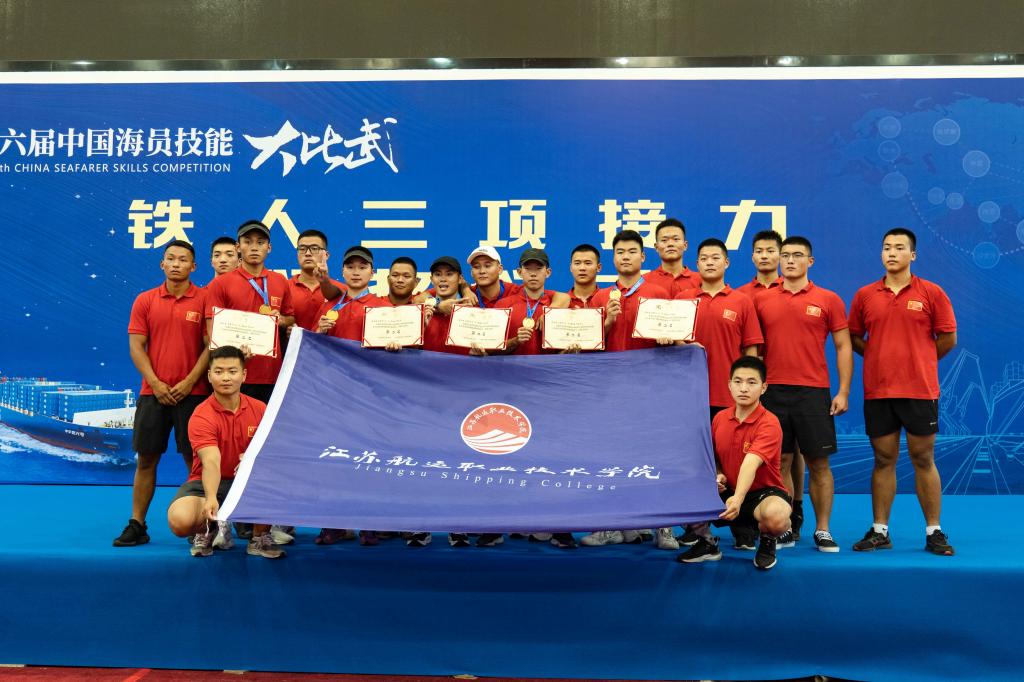 铁人三项接力是大比武中最具观赏性、竞技性和实用性的赛事。每支参赛队派出5名选手进行游泳50米、拖带15公斤重的模拟溺水橡皮人回游50米和攀越救生绳网三个项目接力,拼的是选手们的体力和毅力。此起彼伏的呐喊声、欢呼声中,18支航海院校队的选手们在水中奋勇争先,上演了一场场争分夺秒的“海上救援”。经过激烈的角逐,大连海事大学、江苏航运职业技术学院、上海海事大学摘得比赛院校组的冠亚季军,我校获得了院校组第9名的好成绩。