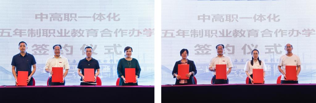 在签约仪式环节,孔志光副书记分别与9所中职学校签订了“中高职一体化五年制职业教育合作办学协议”、与2所中职学校签订了“区域中高职一体化试点五年制职业教育合作办学协议”、与舟山技师学院签订了“中高职一体化(职技融通)五年制职业教育合作办学协议”。