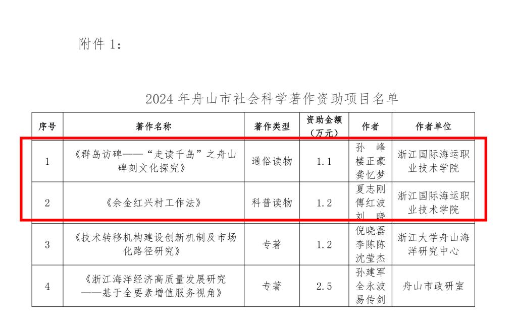 近日,舟山市社科联公布2024年舟山市社会科学著作资助项目,全市共四本著作获得立项资助,我校夏志刚副研究员领衔主编的《余金红兴村工作法》、孙峰研究员领衔主编的《群岛访碑——“走读千岛”之舟山碑刻文化探究》位列其中。