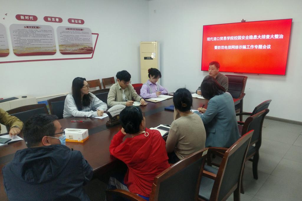 为进一步落实安全工作责任,防范化解学院安全隐患,坚决遏制电信网络新型违法犯罪高发频发态势,切实守好师生的“钱袋子”,维护学院安全稳定,5月10日上午,现代港口贸易学院在海德楼304会议室召开了校园安全隐患大排查大整治暨防范电信网络诈骗工作专题会议,学院行政班子成员、辅导员、实训管理员参加了会议。