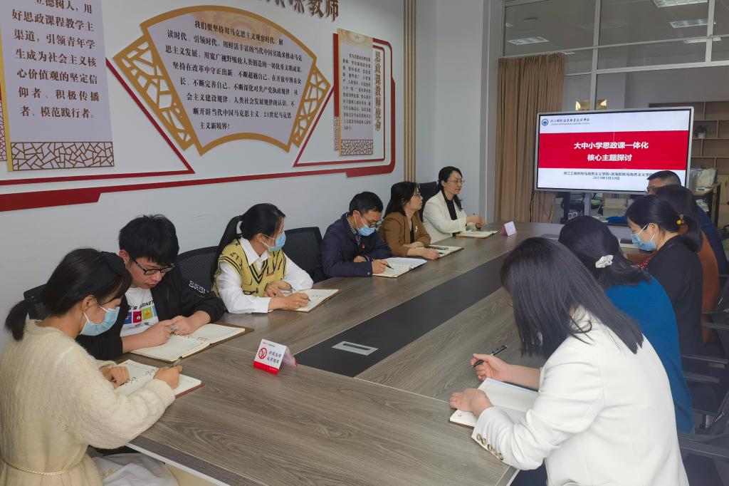 来自浙江工商职业技术学院马克思主义学院党总支书记、副院长靖国华副教授一同参加座谈会,并对我校马院建设、大中小学思政课一体化工作、思政课教师教学竞赛、校外实践基地教学方式提出指导意见。