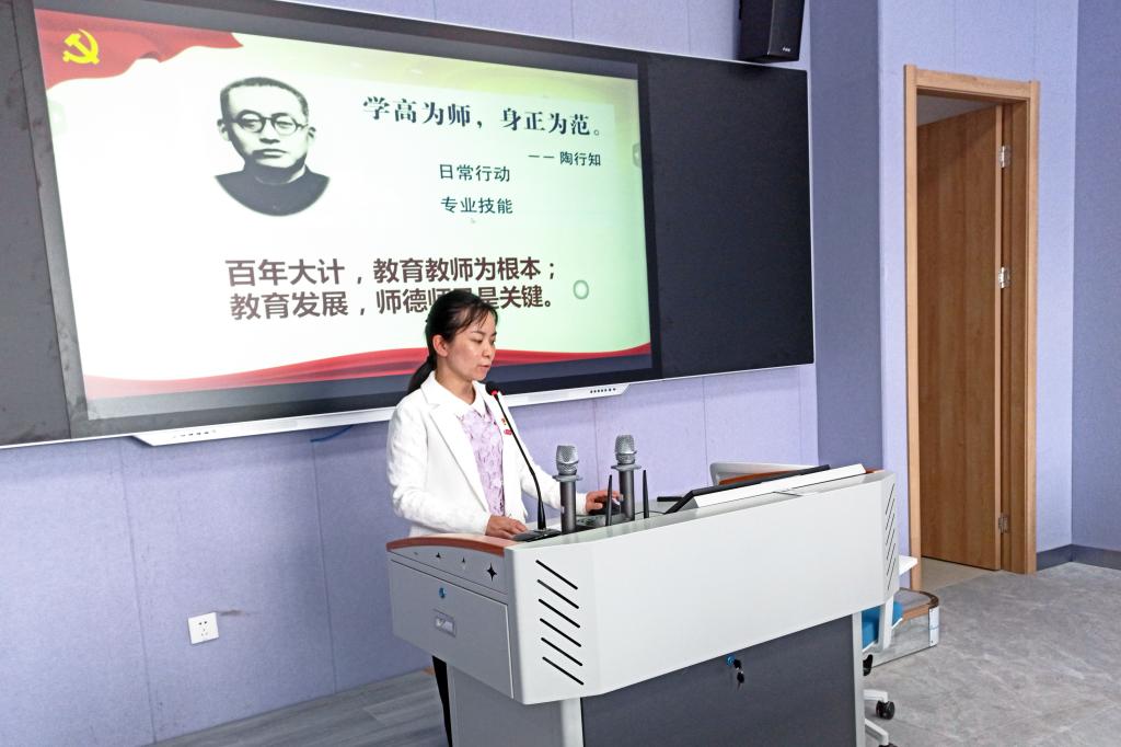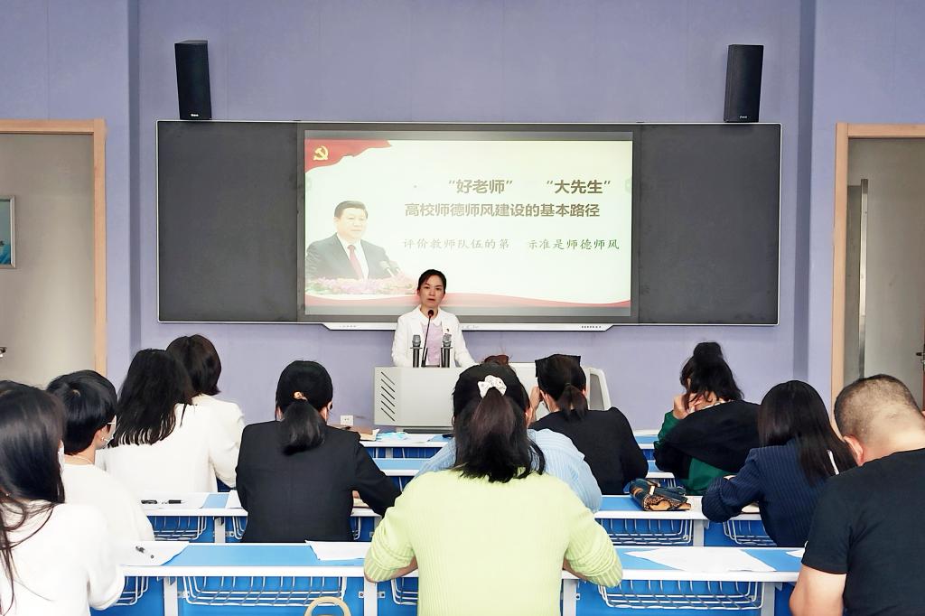 马克思主义学院党支部书记熊孜为党员教师上主题党课,她结合习近平总书记关于高校师德师风建设的系列重要论述,特别是在北京师范大学和清华大学考察时提出的成为“好老师”、争做“大先生”的师德要求,从“教师、师德、师风”解读、师德师风建设的重大意义、加强师德师风建设的基本要求、党和国家加强高校师德师风建设的基本政策等角度展开阐述。