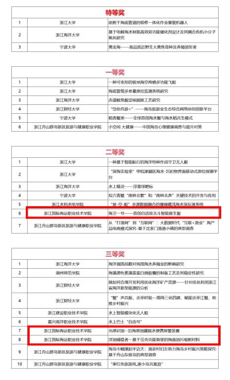 本次大赛学校积极组织、广泛发动学生参赛,荣获了二等奖一项、三等奖两项的佳绩。其中由航海工程学院虞磊、徐超老师指导,俞坤、何铭辉、刘笑麟、李炎、蒋苏杭、杨佳琪团队的《海卫一号——首创自适应北斗智能救生服》荣获二等奖,由石油化工学院高良军、杨加力、张乐老师指导,丁淳、周晨超、毛永翔、潘佳盈 屈少奇、李嘉琪、王友钦团队的《光感识油——沿海原油罐脱水便携报警装置》、由石油化工学院高良军、杨加力老师指导,程素馨、余烨、胡宇杰、徐伟博、王炜屹团队的《浮油捕猎者一基于贝壳功能骨架的海面油污吸附材料》荣获三等奖。