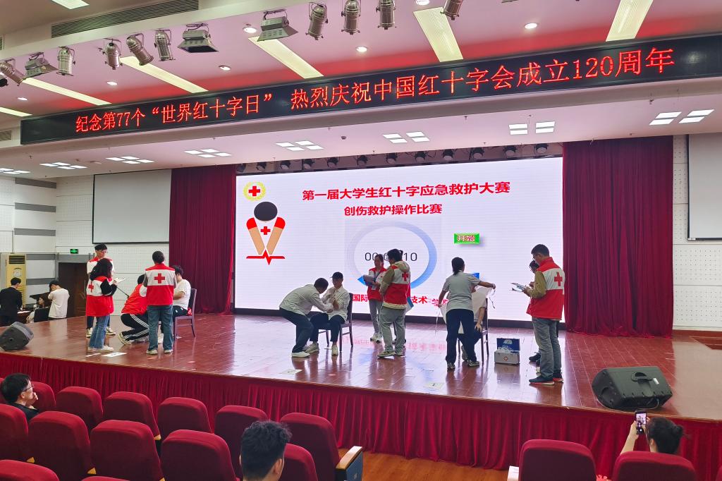 今年是中国红十字会成立120周年,5月8日是第77个“世界红十字日”。5月8日下午,由学校红十字会主办的“关爱生命 救在身边”第一届大学生应急救护大赛在图书馆4楼报告厅举行。市红十字会党组成员、副会长许平,校党委委员、副校长、校红十字会长曹志斌和各二级学院相关负责人及学生代表参加了本次活动。