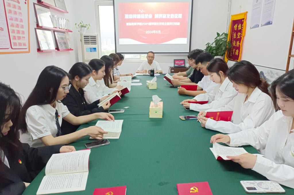 为加强毕业生党员离校教育,引导厚植青年党员爱党爱国情怀,坚定不移听党话、跟党走,争做堪当民族复兴重任的时代新人,6月16日,国际教育学院党总支在1501会议室召开2024届毕业生“凝心铸魂担使命 踔厉奋发启征程”主题党日暨最后一次党课活动,学院院长、党总支副书记吴旭光,党总支副书记虞艳娜,学院分团委负责人邓玉环、辅导员及2024届全体毕业生党员参加活动。