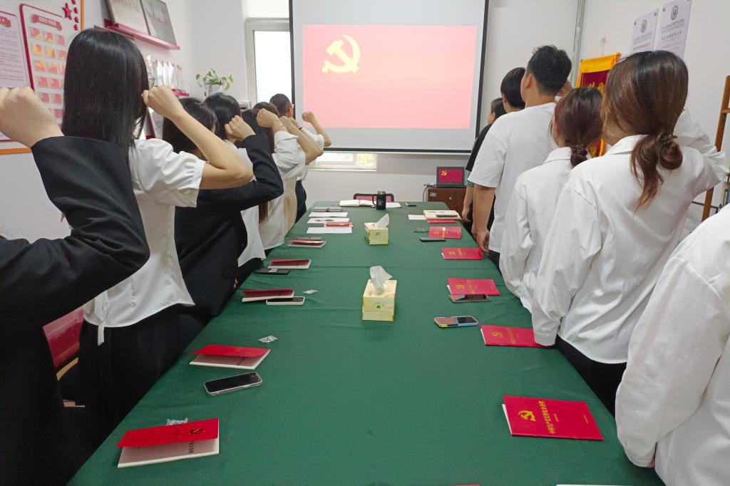 在邓玉环老师的领誓下,全体党员面对鲜红的党旗,重温入党誓词,铮铮誓言在会议室回荡,激起了毕业生党员们戮力同心、不懈奋斗的决心和斗志。
