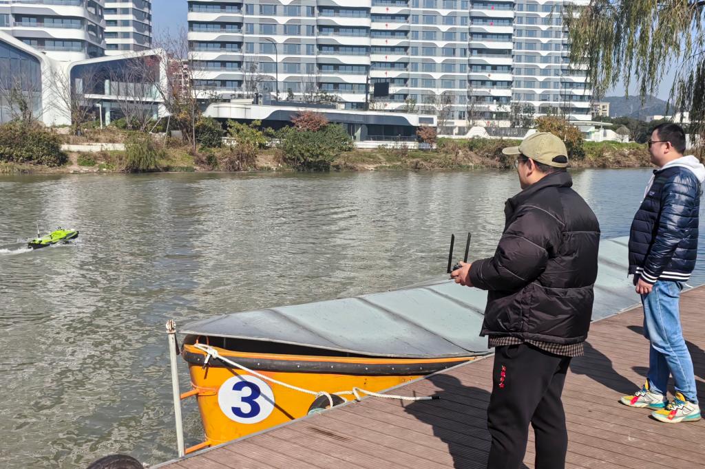 座谈会前,中海达华东区解决方案经理包新刚在我校西侧河中演示了该公司自主研制的无人船在复杂条件下自主航行,以及水底地形、水流测量等功能。我校李子强老师等也进行操作,了解该船性能,探讨其对于我校无人船舶教学培训的适用性。
