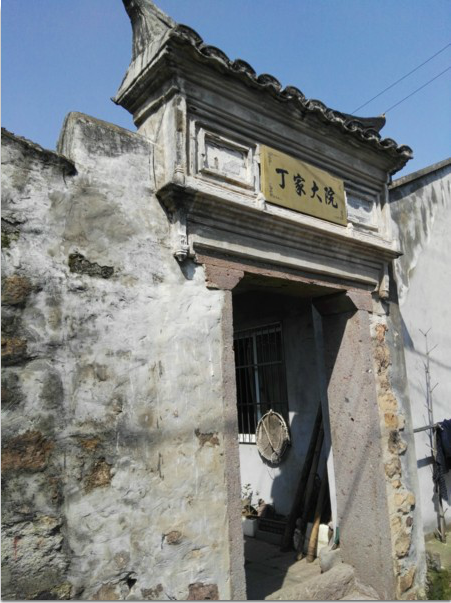 丁家大院,建于清代,迄今已有200多年。原有三进建筑,至今保存着第二进、第三进,占地面积2000平方米,建筑面积1200平方米。丁家大院墙门门框用粉红色石条构成,门框上方是三个长方形的画框,中间框上现挂着“丁家大院”匾。从墙门进入,穿过一石板铺就的过道,是丁家第二进院子,第二进院子正屋七间,左右厢房各二间。整幢院落用材讲究,装饰十分庄重典雅,正屋通面阔近5米,前壁都是木板壁,廊柱粗圆,底下是滚圆的石础,圆柱上面是十字斗拱。