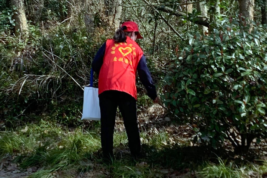 现场热火朝天,志愿者们热情洋溢,活力满满,认真细心地在坡度60度的山上清理着垃圾。