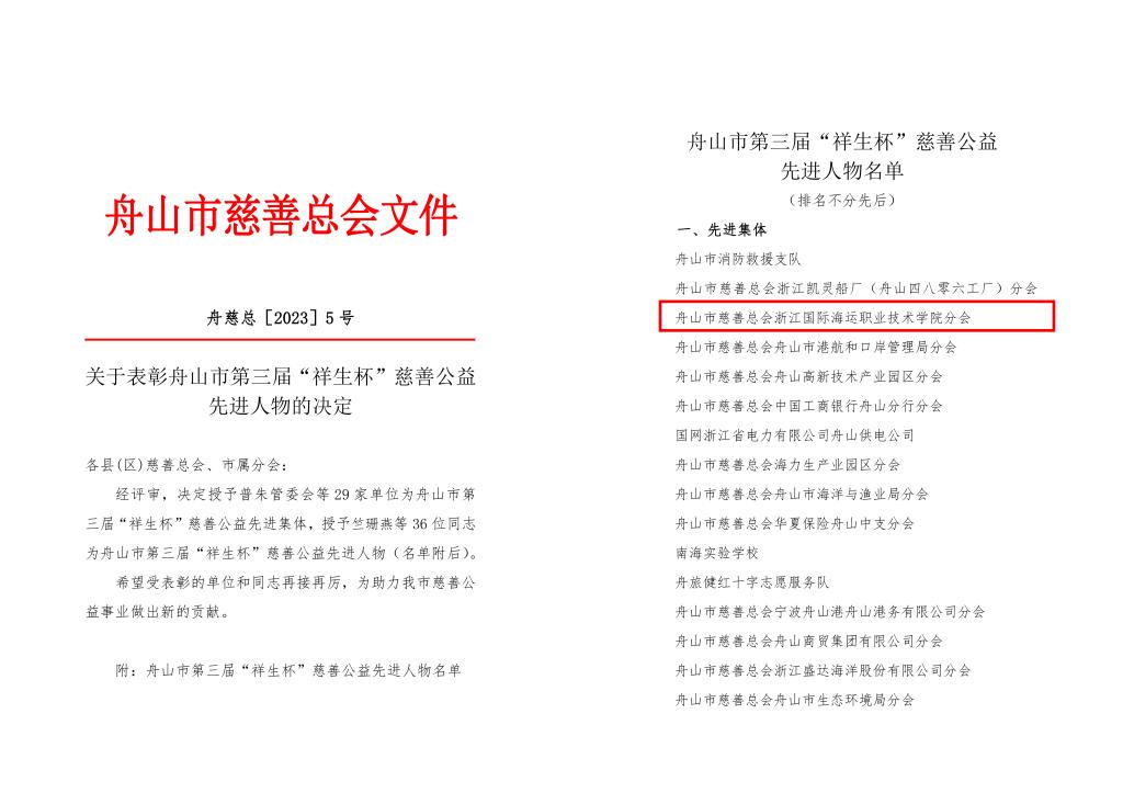 近期,舟山市慈善总会发布了《关于表彰舟山市第三届“祥生杯”慈善公益先进人物的决定》,校慈善分会荣获舟山市第三届“祥生杯”慈善公益先进集体称号。