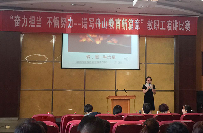 我校海洋旅游学院郑弋炜老师代表学校参加。她围绕“爱是一种力量”--用爱谱写舟山职业教育新篇章为主题,结合我校教育教学工作实际,畅谈践行新区教育教学工作的责任和奉献情怀,精彩的演讲博得了评委的认可和现场观众的共鸣。最终,郑弋炜老师荣获了大赛二等奖。